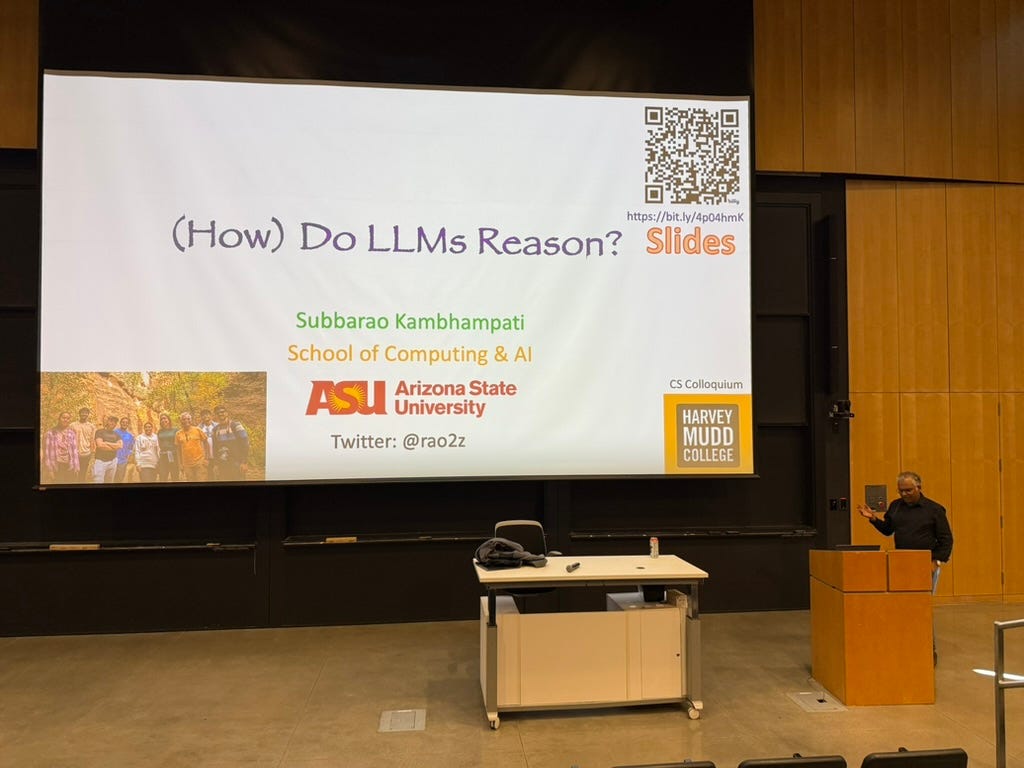 Last week, Prof. Rao Kambhampati from Arizona State University visited Harvey Mudd to give the first CS Colloquium talk of the year. With the provocative title “(How) Do LLMs Reason?”, Rao explained (pretty convincingly) why the self-talking “reasoning traces” that are part and parcel of large reasoning models like GPT-4o aren’t really all they’re cracked up to be. Slides here.