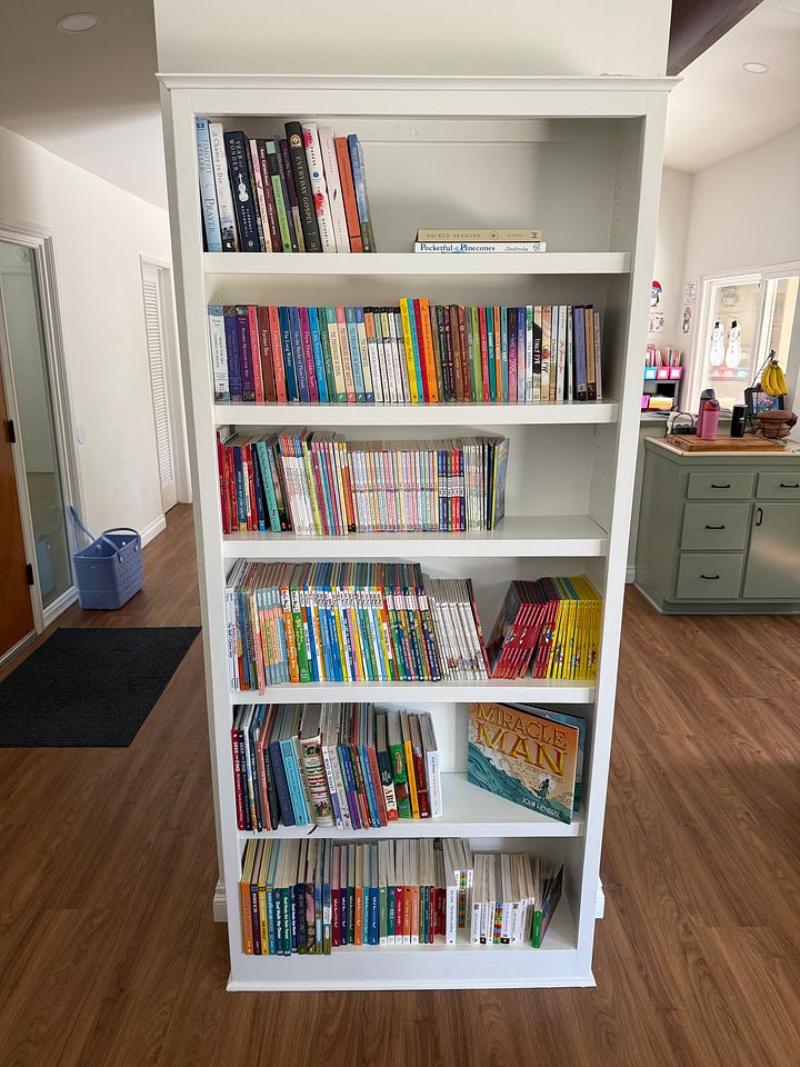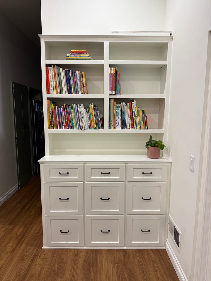 As we continue to settle into our new digs, we finally finished what felt like an important step. The built-in bookshelves that were the last project (for now) on the list for our painter, Mr. John, were finally done, repainted in Swiss Coffee to match the walls. As we installed them last week and I brought in box after box of books from the garage where they had been living for the past few months, there was an almost palpable new sense of home and rest. We love our books in the Brake household.