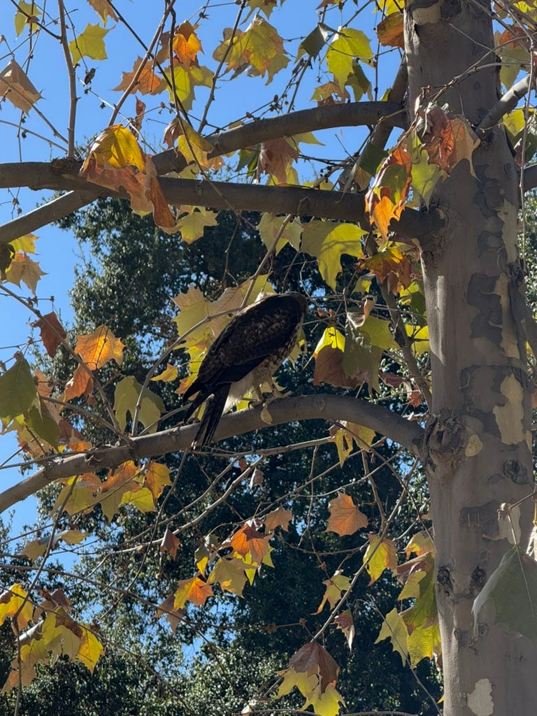 Last week, I was walking to the dining hall and saw a bunch of people staring up into a tree. I didn’t see anything at first. As I got closer and walked by, I finally spotted it. A pretty amazing bird was tucked into the branches of the tree.