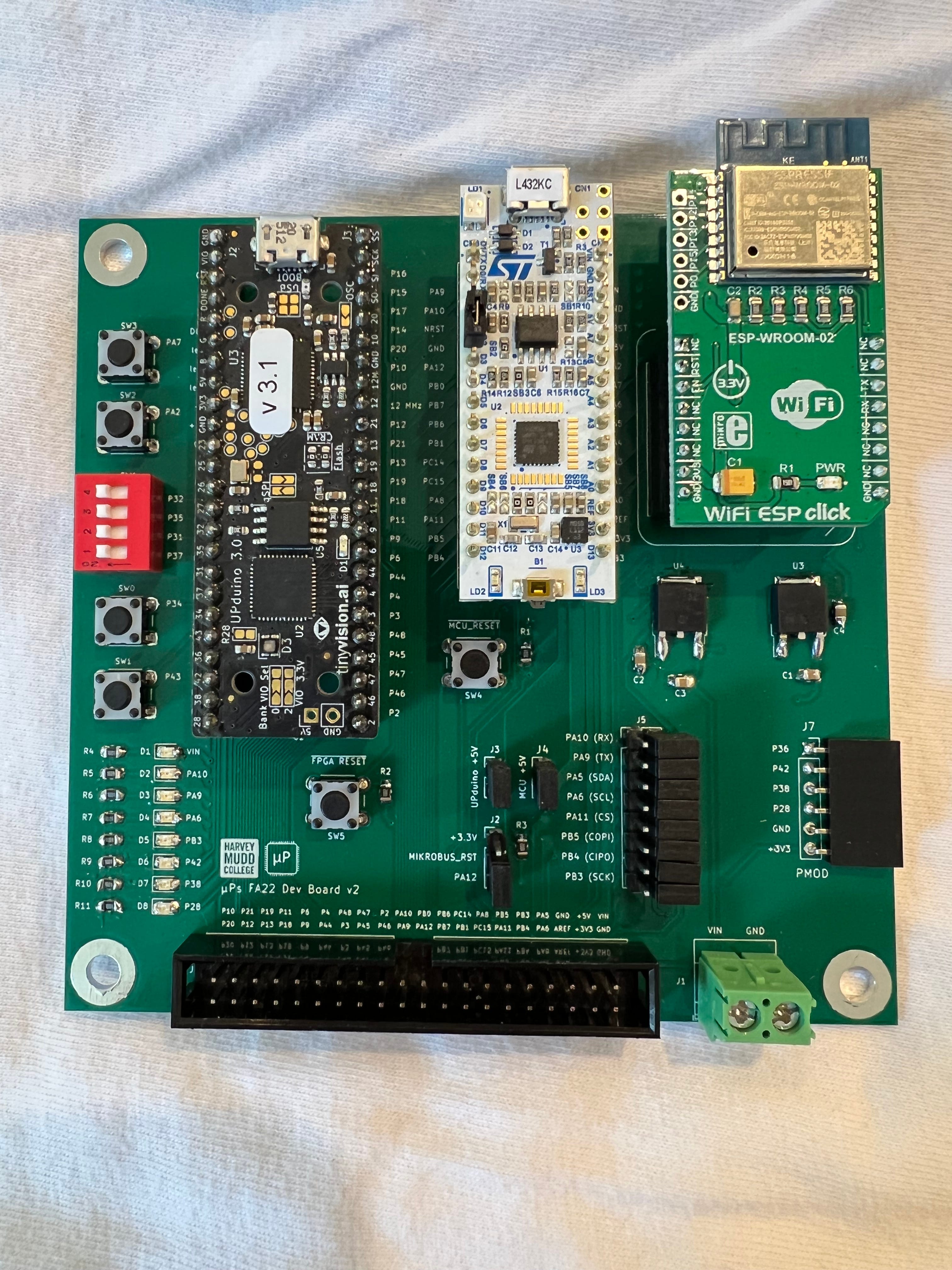 Most of the labs for this fall are updated and ready to go, but I’m experimenting with a new WiFi extension board (top right hand corner) that houses an ESP8266 (one of the most popular chips for IoT devices; if you have a smart lightbulb or thermostat it almost certainly has this chip or a very similar one). Hoping that it will help to make the WiFi lab that we run in E155 even a bit more seamless!