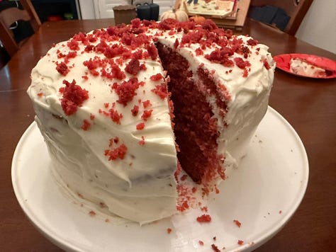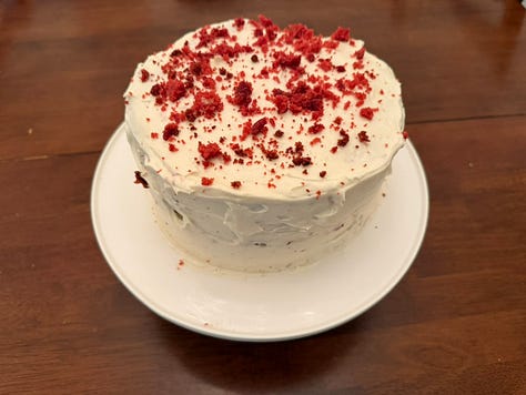 #1’s birthday was last week, so I gave my red velvet cake recipe from last year another try. This year, I was determined to make it actually red, instead of just a shade of pink like last year, when I ran out of red food coloring. After dumping a full tube of red gel coloring into the batter, I’m happy to report that I achieved my goal.